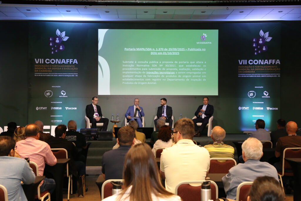 O VII Conaffa segue até este sábado (25), em Bento Gonçalves, com uma série de debates e grupos de trabalho voltados à definição de diretrizes para o fortalecimento da carreira dos auditores fiscais federais agropecuários. A programação inclui ainda discussões sobre combate ao assédio institucional e valorização do serviço público, temas que reforçam o compromisso da carreira com a defesa da sociedade e o aprimoramento das políticas públicas agropecuárias.